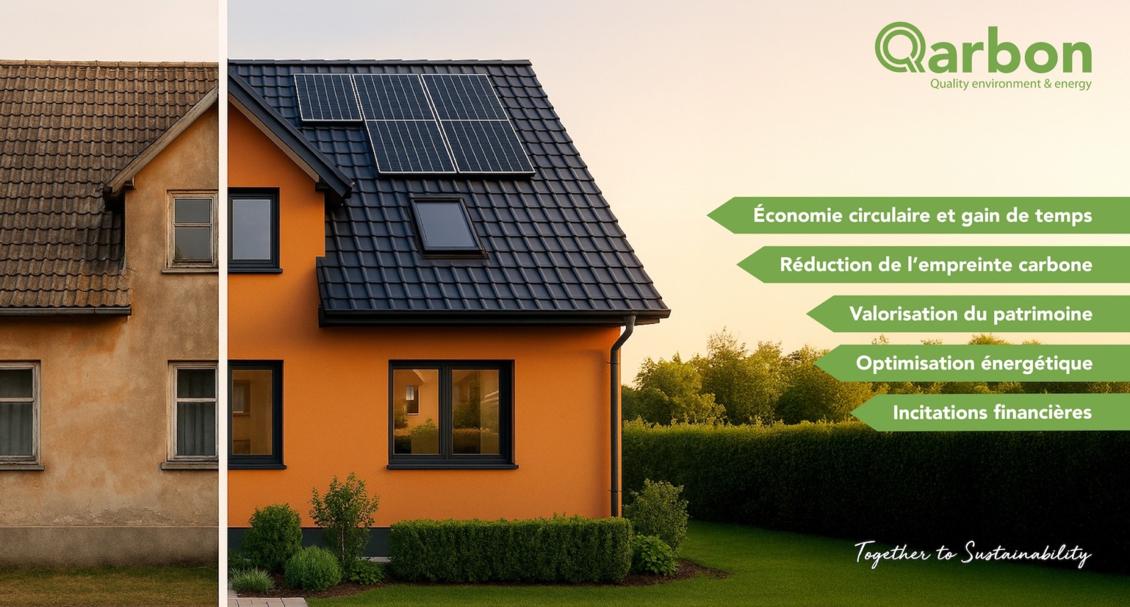 Rénover un bâtiment existant présente de nombreux avantages, tant sur le plan économique qu’environnemental. Chez Qarbon, nous accompagnons nos clients dans la réalisation de projets durables, en optimisant leur efficacité énergétique et en les assistant dans leurs démarches de demande de subsides.